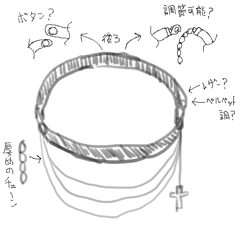 1.参考画像を提示していただいた為拝見し、チョーカーの素材やパーツについて相談、十字架か蜘蛛のチャームかどちらか検討したのち、初期デザイン画を製作